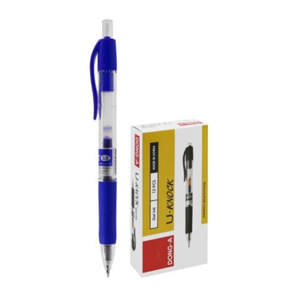 Kuličkové pero gelové U – knock 0,5mm modré Gelové pero se stiskací mechanikou a transparentním tělem v barvě náplně, průměr kuličky je 0,5 mm.