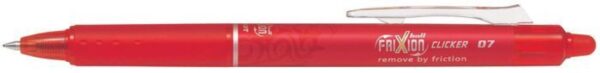 Kuličkové pero PILOT Frixion gumovací červené bez víčka cvakací Clicker 0,7 Klikni! Napiš! Vymaž! Přepiš! Přepisovatelný roller FriXion Clicker. Jedinečný výrobek v provedení bez víčka. Stačí kliknout a psát! Speciální inkoust – napsaný text lze vymazat a znovu přepsat na tomtéž místě tolikrát, kolikrát chcete. Text zneviditelníte zahřátím na 65 °C, které vznikne třením plastového zakončení rolleru na papíře. Znovu se objeví při teplotě nižší než -15 °C. Pero má výměnnou náplň. Nepoužívejte na oficiální dokumenty.